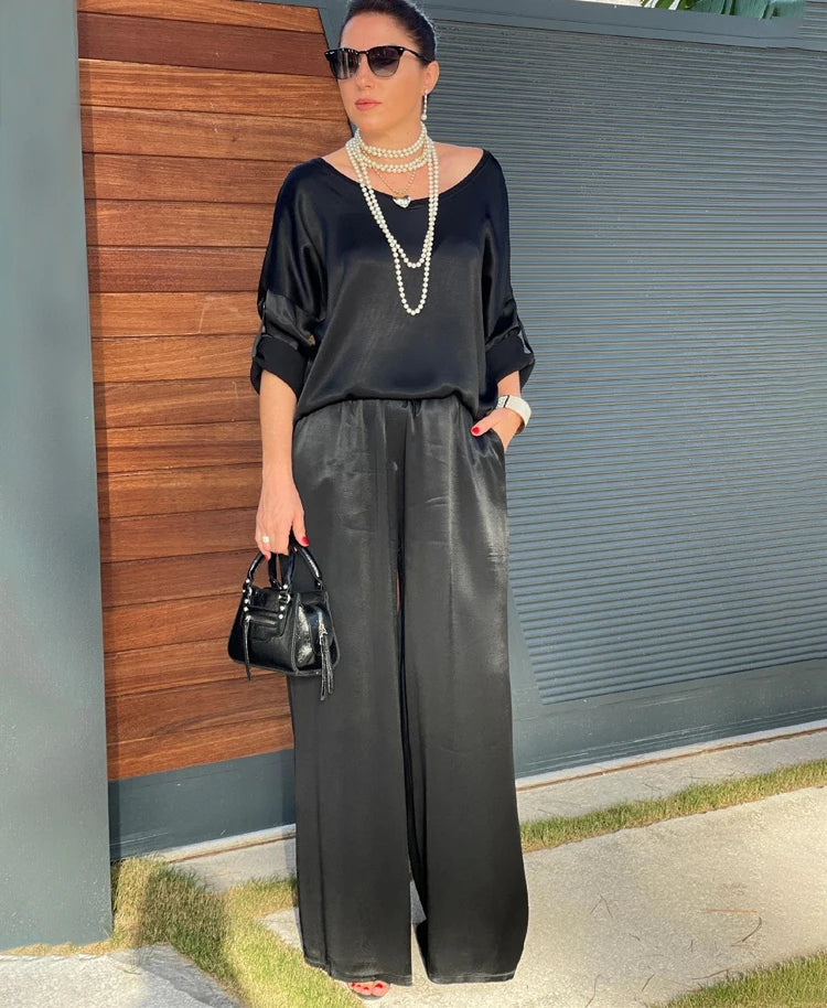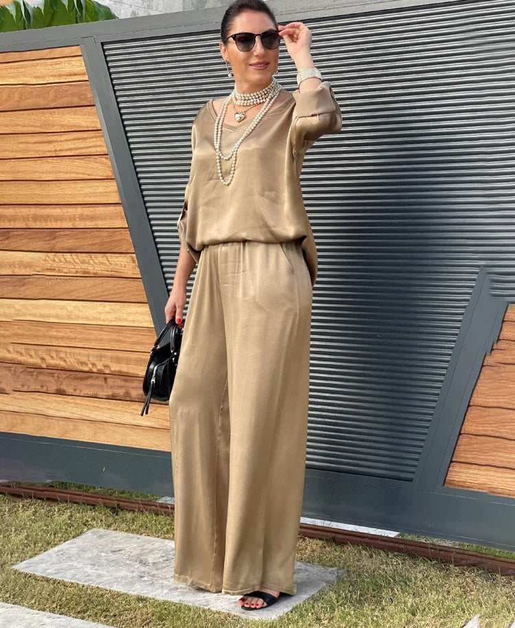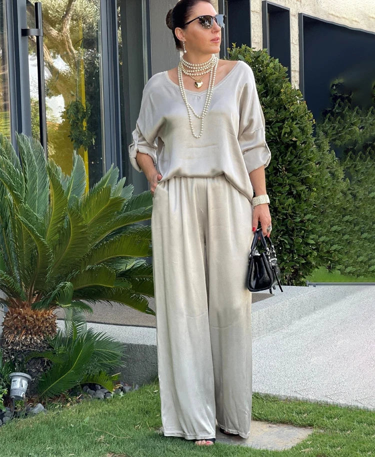 As peças são fluidas e elegantes permitindo compor outros looks combinando a calça ou camisa com outras peças.