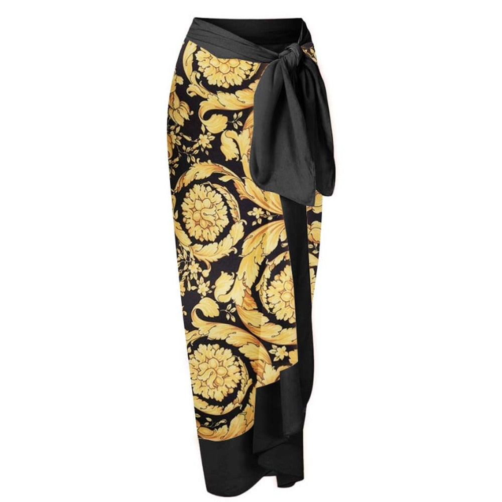 As saídas de praia em formato de saia também são famosas. Esse modelo cobre as pernas, mas os tecidos fluidos dão um efeito lindo em quem usa.