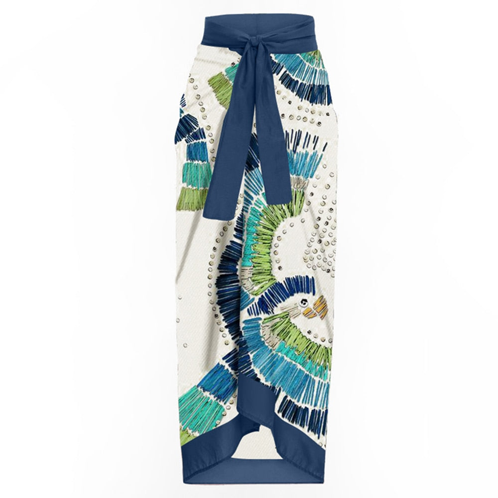 As saídas de praia em formato de saia também são famosas. Esse modelo cobre as pernas, mas os tecidos fluidos dão um efeito lindo em quem usa.