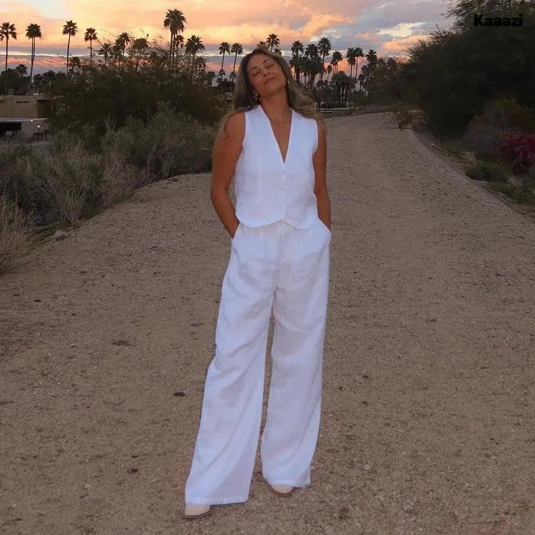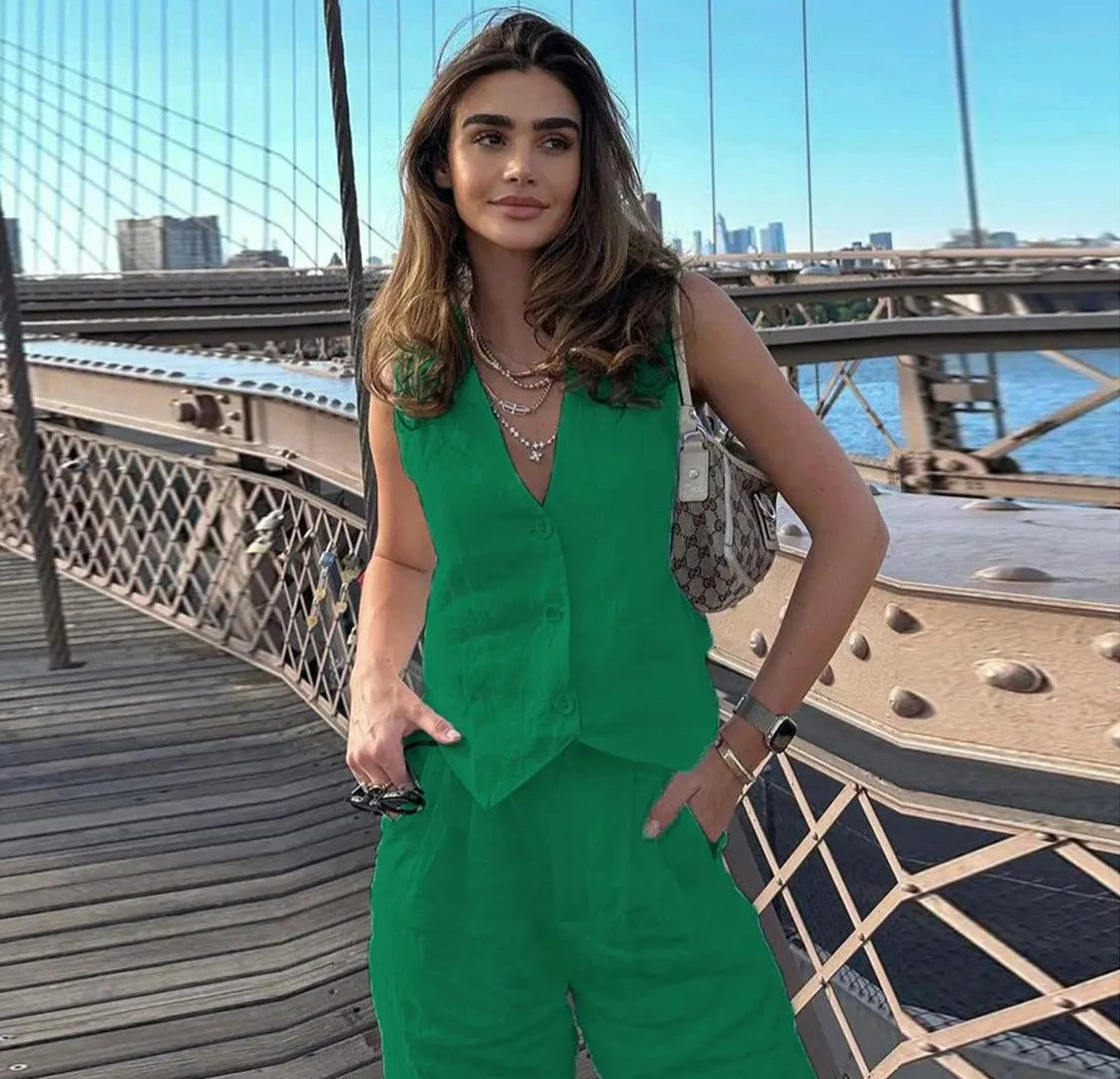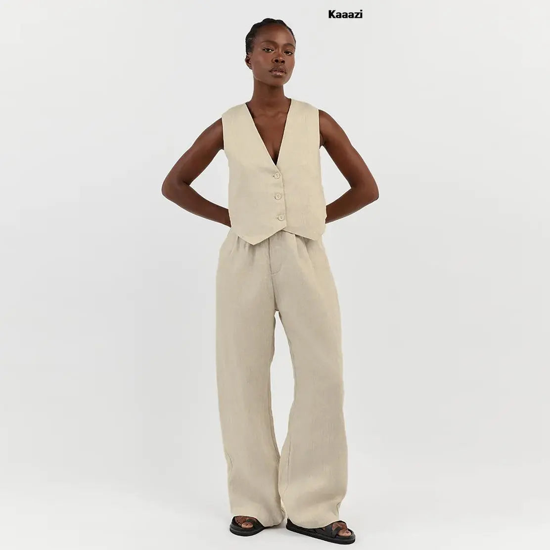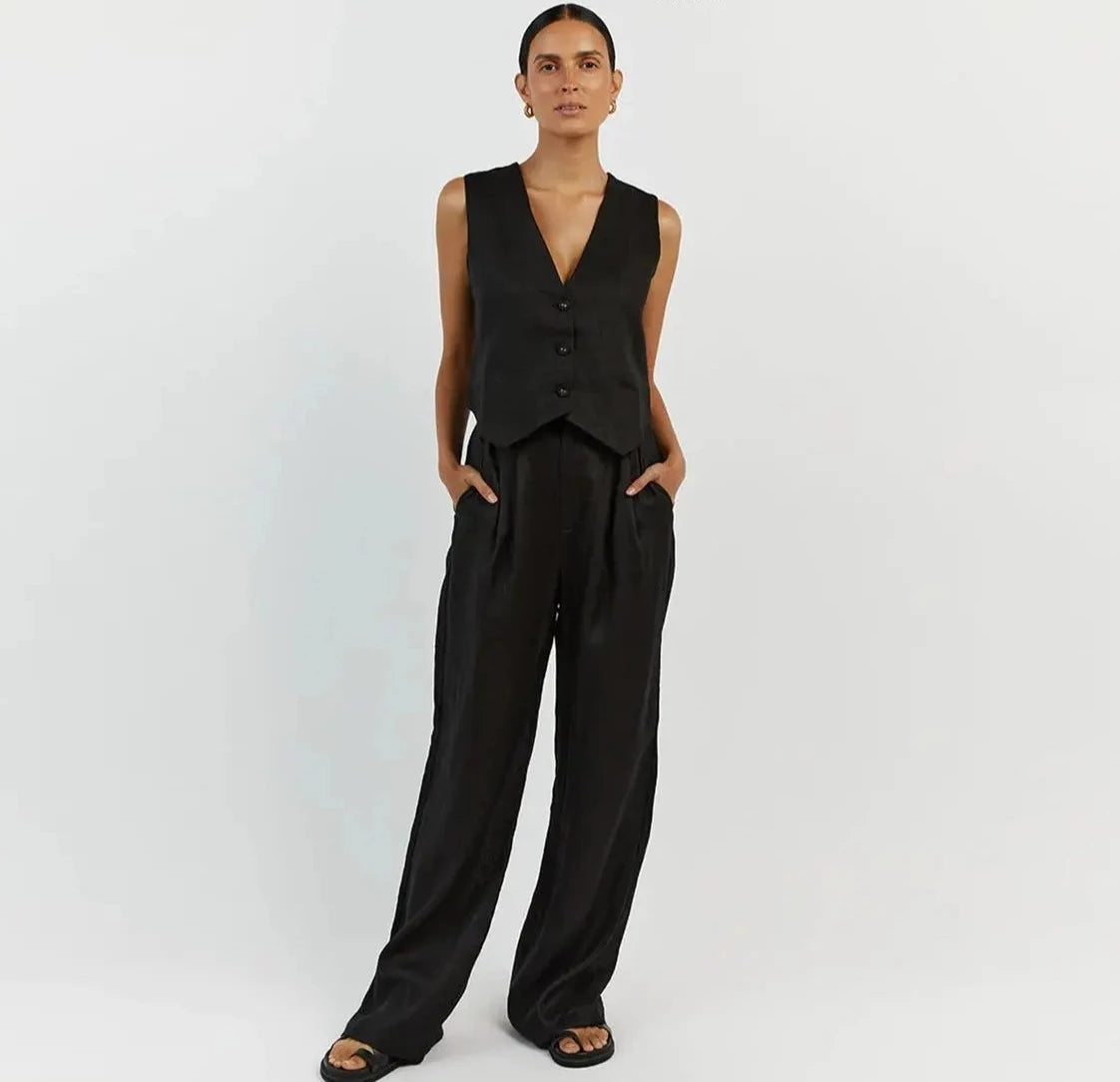 Conjunto composto por colete e calça. Confeccionado em Linho Premium, esse tecido possui composição mista de viscose e linho, ambas com fibras naturais que permitem toque ainda mais macio e proporciona respirabilidade do corpo dando frescor ao look. Tem uma textura rústica que garante elegância e conforto, possuindo um toque ainda mais macio.