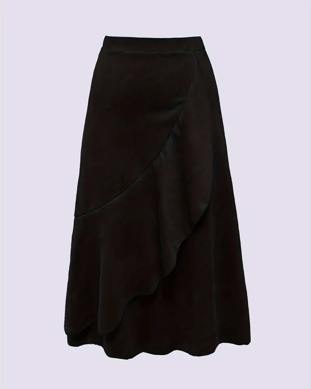 O recorte assimétrico com camada sobreposta e babado discreto garante movimento e feminilidade ao visual, valorizando diferentes tipos de corpo com muita leveza.