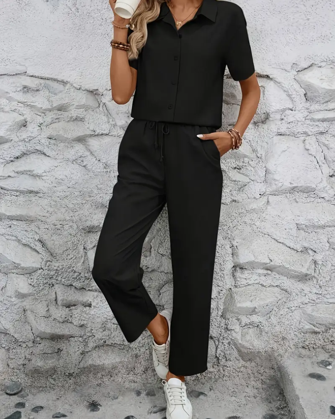 As peças são fluidas e elegantes, permitindo compor outros looks combinando a calça ou camisa com outras peças.