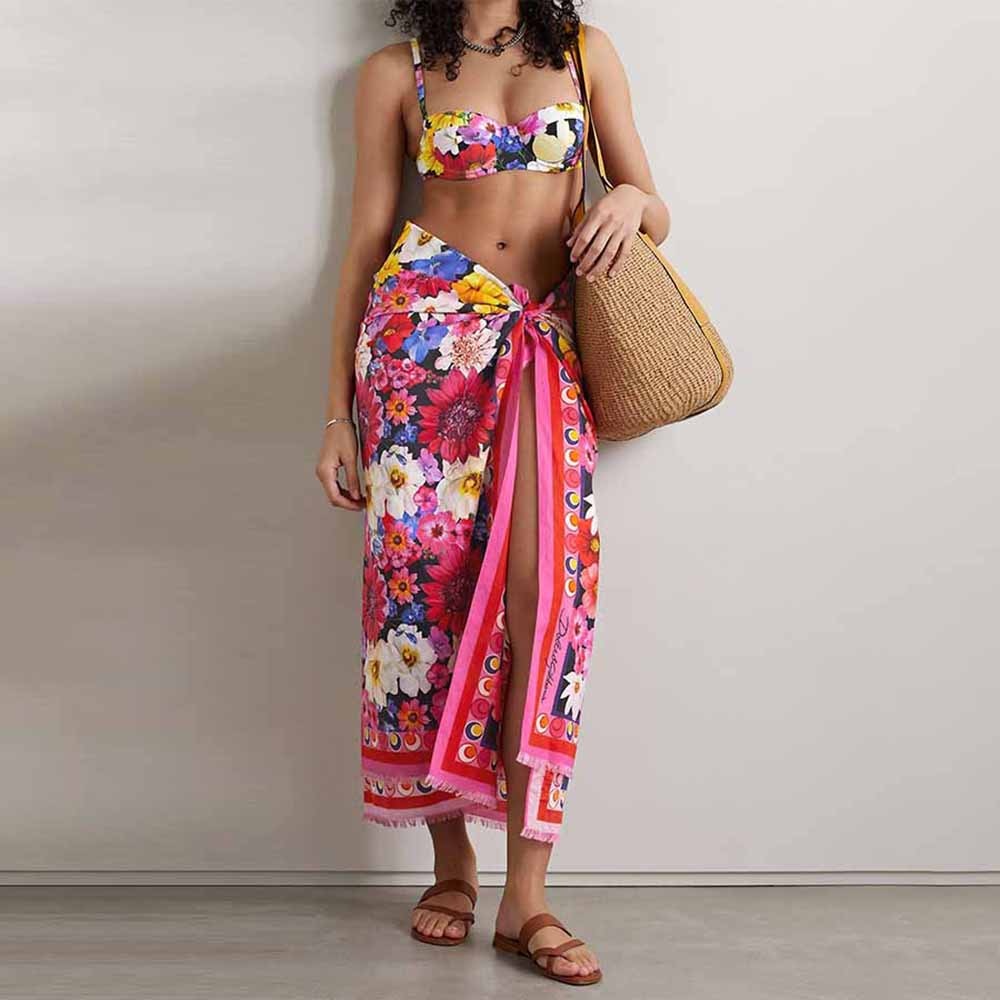 As saídas de praia em formato de saia também são famosas. Esse modelo cobre as pernas, mas os tecidos fluidos dão um efeito lindo em quem usa.