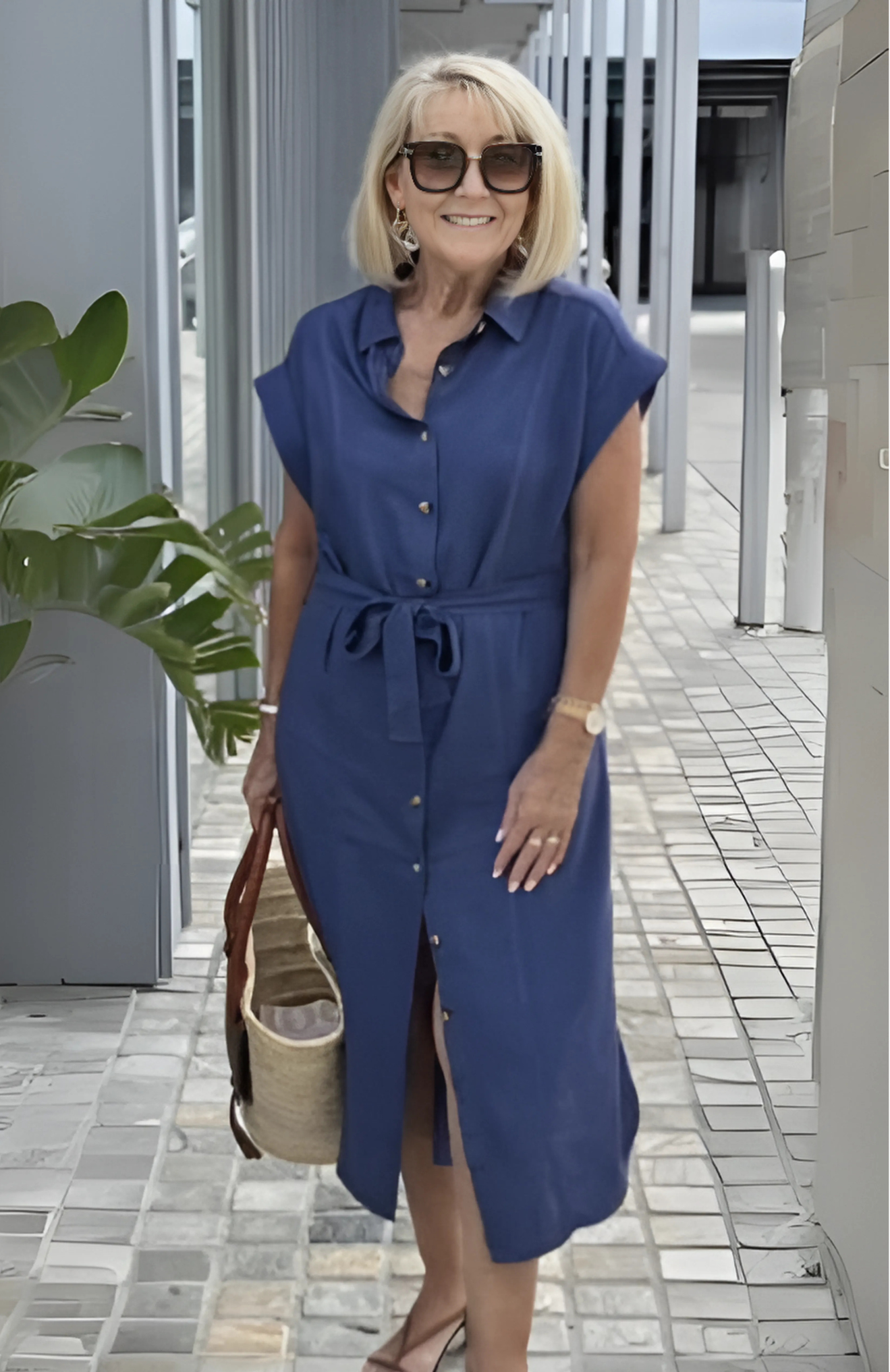 • Detalhes: Feito em um tecido azul que lembra o denim, ele apresenta botões na frente e um cinto que marca a cintura, criando uma silhueta feminina. As mangas são curtas, e o vestido tem um comprimento que vai até acima dos joelhos. O modelo combina praticidade com um toque de sofisticação, ideal para o verão, especialmente com acessórios como o chapéu de palha e a bolsa de palha que a modelo está usando.