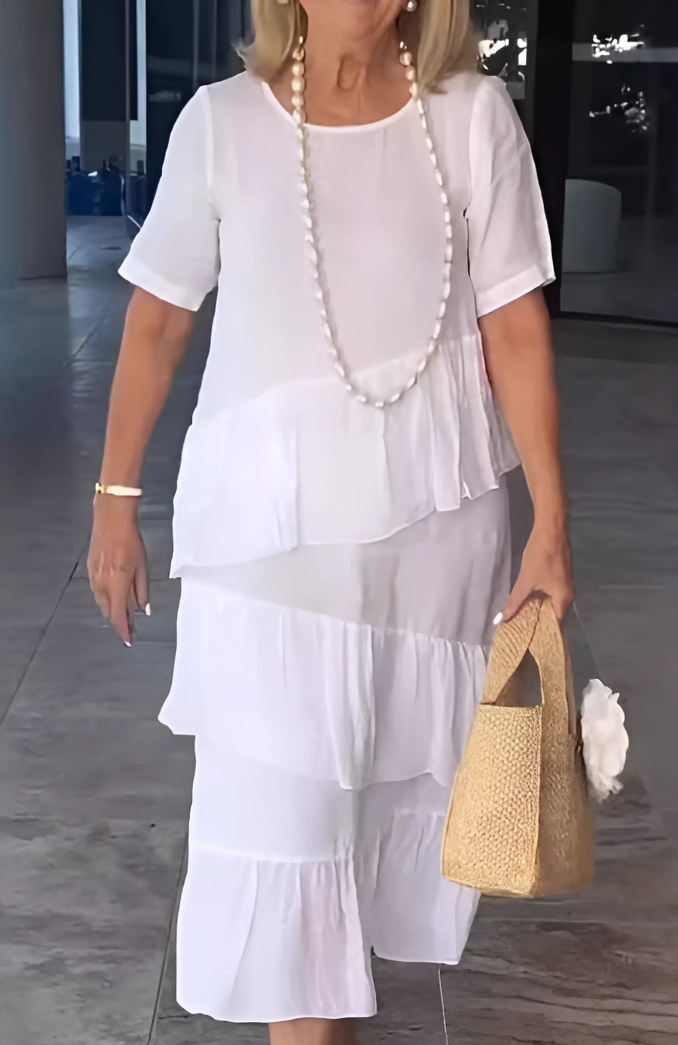 •  Detalhes:  Com camadas de babados que criam um efeito fluido e leve. Ele possui mangas curtas e comprimento midi, oferecendo um visual elegante e confortável. O tecido parece leve e fresco, ideal para o clima quente.