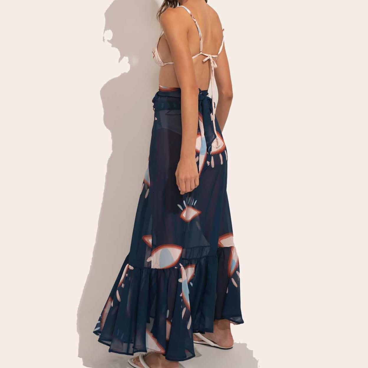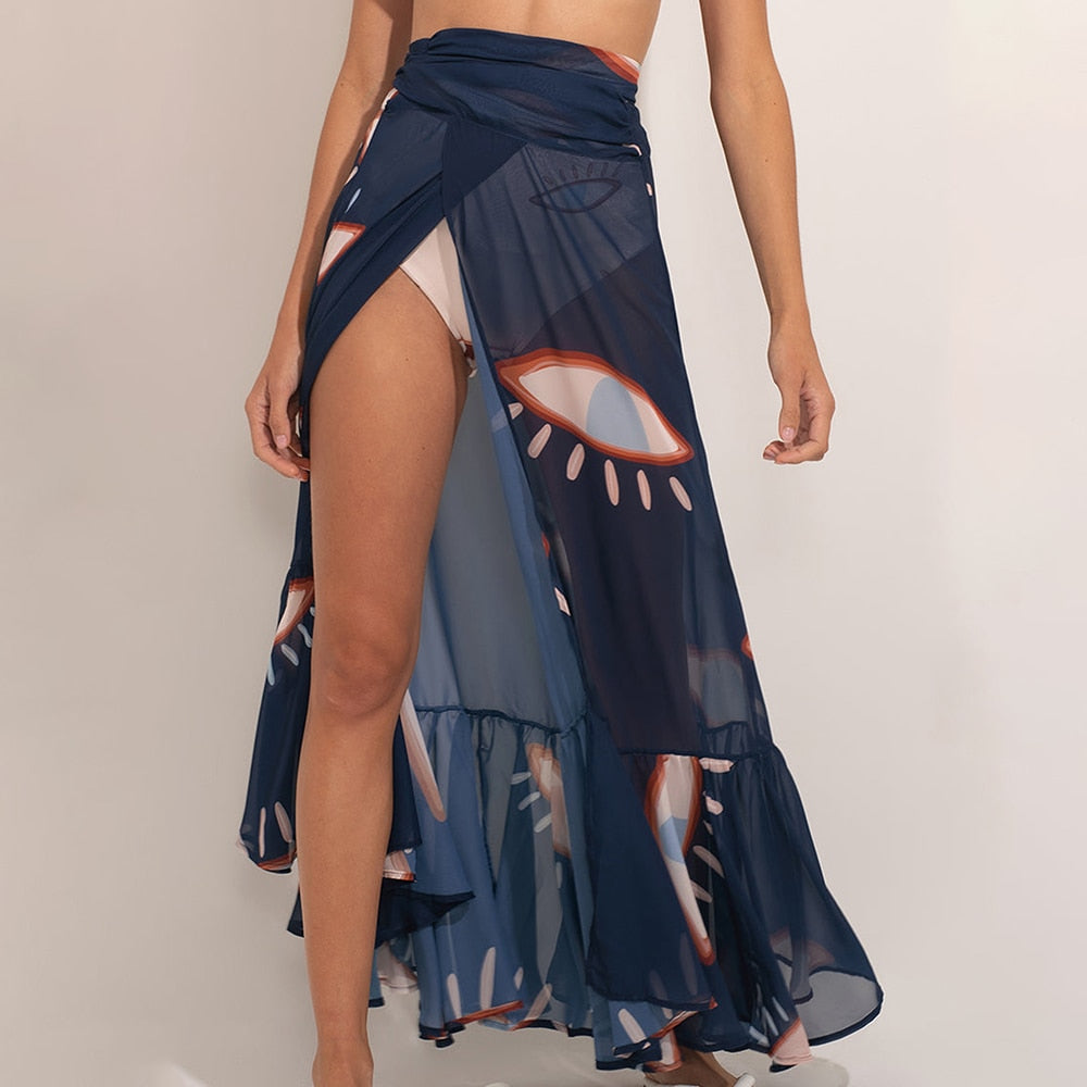 As saídas de praia em formato de saia também são famosas. Esse modelo cobre as pernas, mas os tecidos fluidos dão um efeito lindo em quem usa.